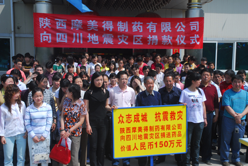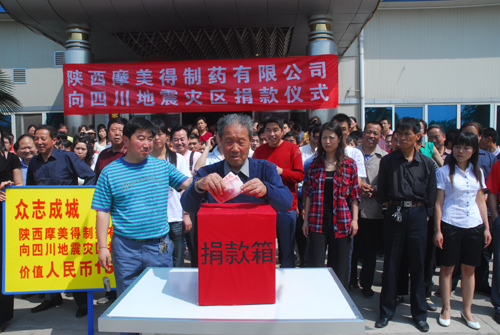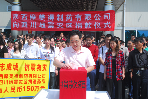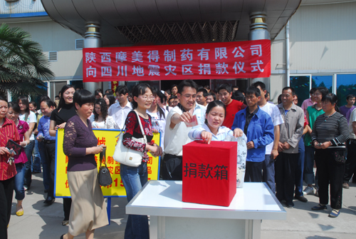 5月12日,四川省汶川县发生里氏8.0级地震后,在外洽谈业务的公司董事长王保安先生,5月12日晚和5月13日多次给在公司的几个副总和办公室打电话,督促与政府有关部门联系,向地震灾区捐药捐款。5月14日,公司与咸阳高新技术产业开发区联系,捐送灾区急需药品,价值人民币150万元;5月15日上午,公司组织全体员工及部分家属,向灾区捐款人民币10775元,欧元10元,特别是董事长父亲、年近八旬的王建新老人,也赶到捐款现场捐款;5月16日,公司员工又参加咸阳市药品监督系统捐款,再次向灾区捐款人民币10215元,支援灾区救助及灾后重建工作。