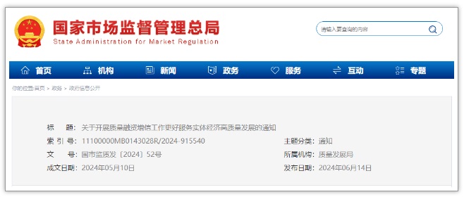 近日,市场监管总局会同中国人民银行、国家金融监管总局联合印发《关于开展质量融资增信工作更好服务实体经济高质量发展的通知》。《通知》遵循质量和金融领域的基本原则和规律,突出质量要素的作用,按照“信息采集、信用评估、贷款服务、贷后管理”的质量融资增信实施全流程进行部署。
