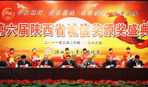 2011年3月25日,第六届陕西省诚信奖颁奖盛典在陕西丈八沟宾馆隆重举行,省政协副主席李进权,省人大原副主任刘遵义、陕西省委办公厅原副主任、省企业信用协会会长刘林亭,全国工经联副会长、原省国资委主任邱世杰、省商务厅副巡视员李升良,陕西省企业信用协会常务副会长、秘书长王平安,副会长刘根科等负责同志以及共建单位的有关负责同志、协会会员代表、获奖企业、国家有关部委及各省、市有关部门负责同志出席了会议,全国各地信用组织、企业代表、有关专家学者共近600余人参加了此次盛典。 第六届陕西省诚信奖以“弘扬华夏精神,共铸盛世商魂,打造诚信陕西,信用誉满三秦”为活动宗旨,由陕西省企业信用协会联合多家相关部门的专家学者,秉承公平、公正、权威的原则,按照诚信、创新、影响力、推动力的标准进行评选,中信银行西安分行行长谢宏儒等十位企业家获得“第六届陕西省诚信奖十大经济人物”荣誉称号,中飞通用航空公司总经理宋庆国等十位企业家获得“第六届陕西省诚信奖十大最具影响力诚信人物”奖,陕西省煤田地质局局长张斌成等十位企业家荣获“第六届陕西省诚信奖十大改革人物”荣誉称号。 组委会同时还对在2010年度经济发展中,企业品牌建设、经济效益再创新高、竞争力、综合实力、信用体系建设有较大提升的中飞通用航空公司等8户优秀企业授予“经济转型升级最具竞争力企业”称号,长安银行等8户优秀企业授予“陕西省诚信建设示范单位”称号。