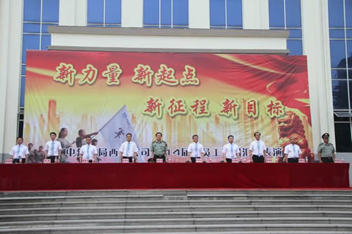 2014年8月4日下午,中建八局西北公司2014届新员工军训汇报表演在兰州军区综合训练营二大队举行,陕西省军区司令部职工处处长杨学东大校,军训团团长杨建文上校,西北公司总会计师张福建,副总经理段辉乐,党委副书记、纪委书记、工会主席王晓波,总经济师杨寿奇,总工程师陈俊杰等领导出席,大会由人力资源部经理朱光军主持。
