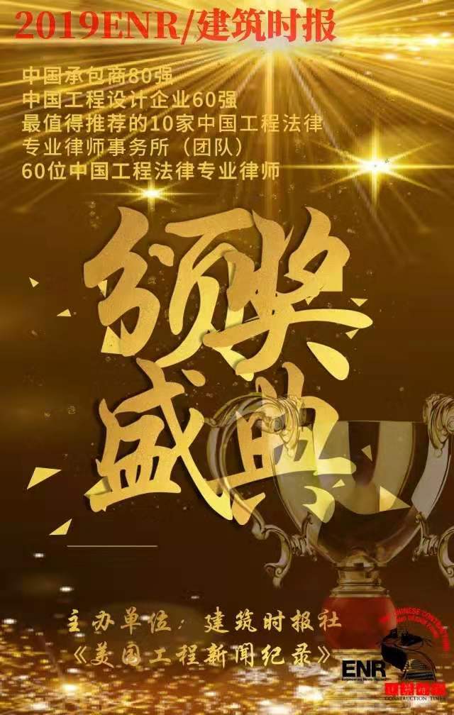 由美国《工程新闻记录》(简称ENR)和中国《建筑时报》主办的2019ENR/建筑时报 “中国承包商80强和工程设计企业60强” 排名,最值得推荐的中国工程法律10家专业律师事务所/60位专业律师等奖项今日正式揭开面纱!